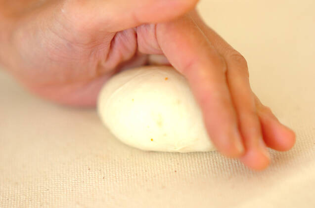 休ませた生地を軽く手で押さえ、もう一度丸め直しをし、フットボール形になるように形を整える。