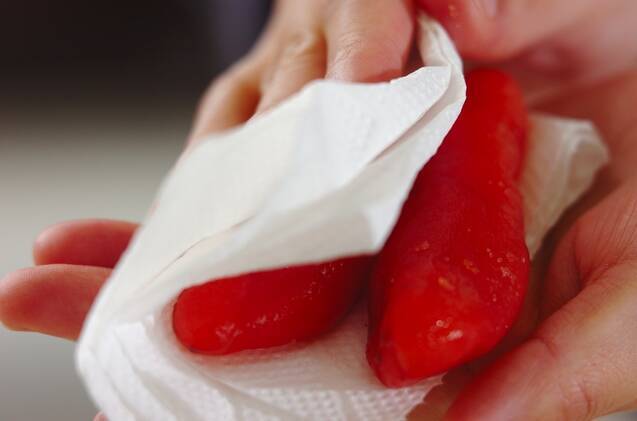 タラコはキッチンペーパーなどで水分をよく拭き取り、キッチンペーパーを敷いたバットにのせて1時間ほど風通しの良いところにおくかラップをせずに冷蔵庫に置いて乾かす。