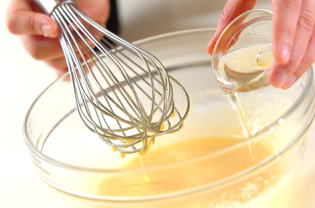 ボウルに卵を溶きほぐし、砂糖を加え、泡立て器でもったりとするまで混ぜる。牛乳とサラダ油を加えて更に混ぜる。