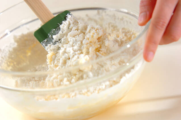 1のボウルに薄力粉、ベーキングパウダーを合わせて振るいながら加え、ゴムベラでサックリと混ぜる。