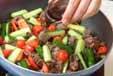 ザッと炒めあわせて<調味料>を加え、からめながら炒めて器に盛る。