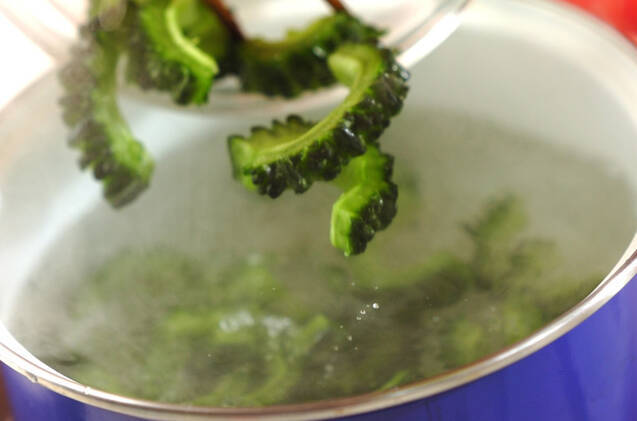 たっぷりの熱湯にゴーヤを塩ごと加え、サッとゆでてザルに上げる。