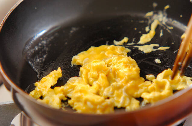 フライパンにバターを熱し、(1)を流して手早くかき混ぜ、しっかり火を通す。