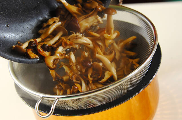 フライパンにゴマ油、ショウガを入れて中火で熱し、(1)のキノコ類を加えて炒める。全体に炒められたら<調味料>の材料を加えて強火にかけ、サッと炒める。炊飯器にザルを重ね、炒めたキノコをあけて煮汁を入れる。
