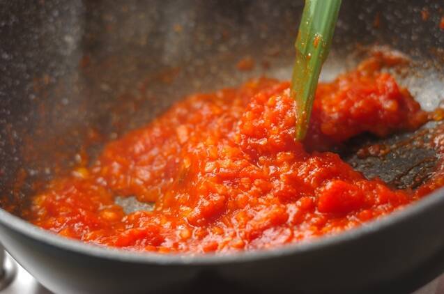 玉ネギがしんなりしてきたら水煮トマトを加え、弱めの中火にする。時々ゴムベラ等で混ぜながら、少しぽってりとするまで10~15分煮詰める。バルサミコ酢、塩コショウで味を調える。