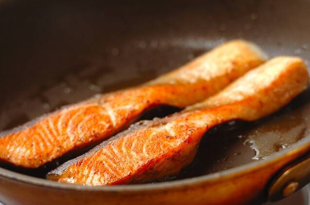 別のフライパンにオリーブ油大さじ1.5を中火で熱し、サーモンを入れて両面焼き色がつくまで焼く。
