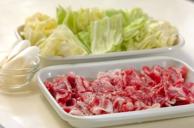 豚肩ロース肉は食べやすい大きさに切り、塩コショウをする。キャベツは大きめのザク切りにする。白ネギは斜め幅1cmに切る。