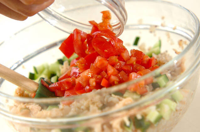 (1)の粗熱が取れたらライトチキン、キュウリ、フルーツトマトを混ぜ合わせる。塩コショウで味を調え、レタスをしいた器に盛る。