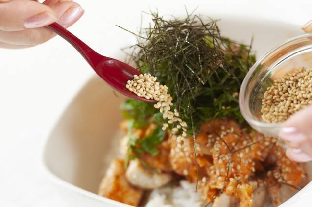 (2)に刻みのり、白ゴマ、お好みで糸唐辛子をトッピングする。