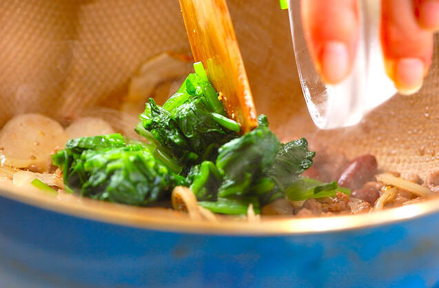 顆粒スープの素、塩コショウ、赤ワインを加え、ほうれん草も合わせる。