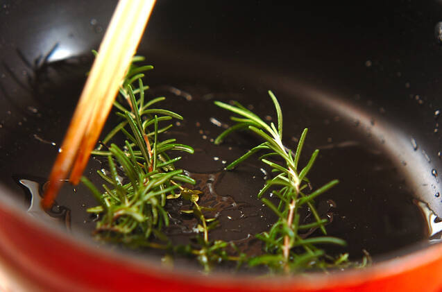 フライパンにサラダ油を入れて強火にかけ、ローズマリー、タイムを軽く炒め、香りを油に移す。ハーブは取り出し、エリンギ、シメジをサッと炒めて塩コショウし、器に盛る。