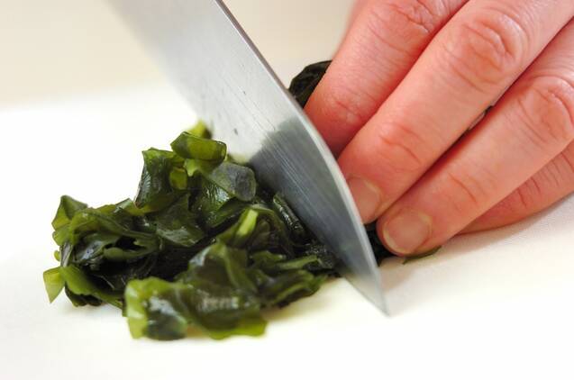 ワカメはたっぷりの水で柔らかく戻し、水気を絞り、ザク切りにする。白菜キムチは大きければザク切りにする。