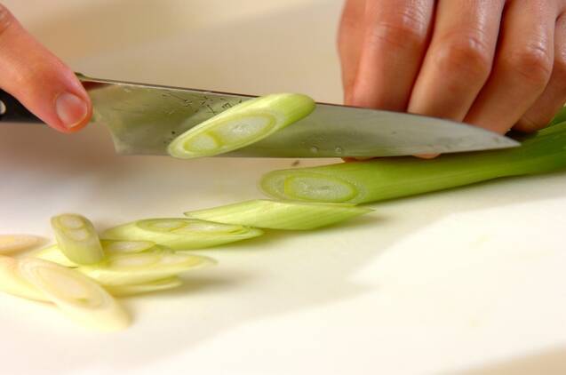 ワカメは水で柔らかくもどし、水気を絞り、長い場合はザク切りにし、青ネギは斜め切りにする。