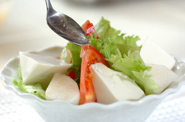食べる直前に器に豆腐、レタス、トマト、梨を盛り合わせ、お好みのドレッシングをかける。