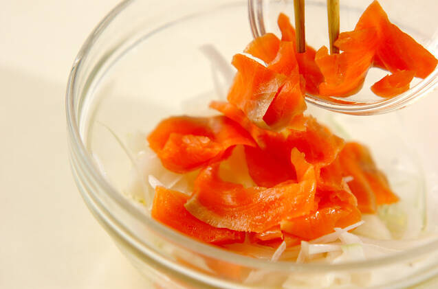 <マリネ液>の材料を合わせ、スモークサーモン、水気をきった玉ネギ、カブ、レモンを加え冷蔵庫で1時間程度冷やす。