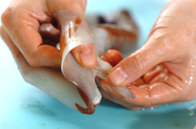 イカは胴の内側にある足の付け根を外し、足を持って胴から引き抜く。胴の中にある軟骨は抜き取り、内側をきれいに水洗いして水気をきる。足は目の際でワタを切り落とし、くちばしを取り除く。足の長さを切り揃えて2本ずつに切る。胴はエンペラをはずして1枚に開き、皮をむいて浅く斜め格子に切り込みを入れ、食べやすい大きさに切る。エンペラも切り込みを入れ、食べやすい大きさに切る。