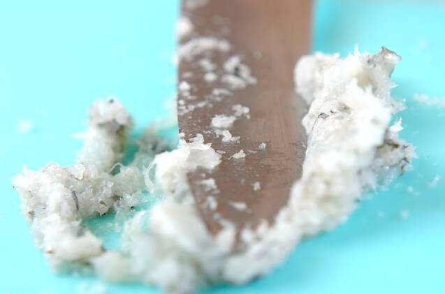 エビは包丁で細かく刻み、包丁を寝かせながらまな板にこすりつけるように粘りを出しながら混ぜ合わせる。他の<エビしんじょ>の材料と混ぜ合わせ4つに丸める。