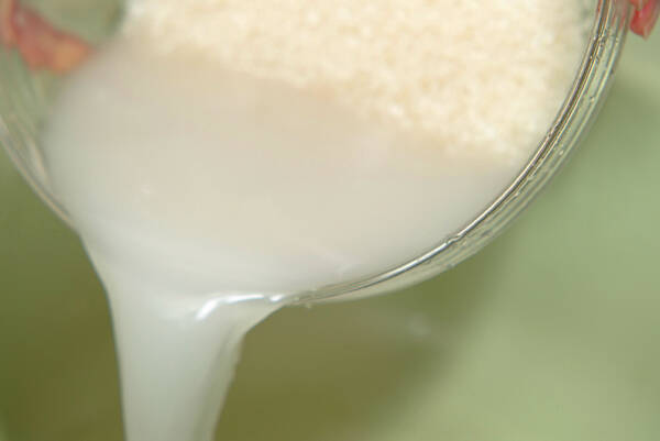 手早く、流水を勢いよくたっぷり加え、ひと混ぜしてぬかやゴミで白濁した水を捨てる。水が白濁しなくなるまで、何回か流水で手早く洗い流す。