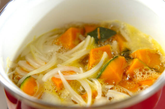 鍋にカボチャ、玉ネギ、水を入れて火にかけ、煮たったら弱火で6~7分煮る。