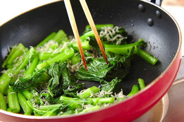 フライパンにゴマ油を強火で熱し、カブの葉、チリメンジャコを加えて炒め合わせる。