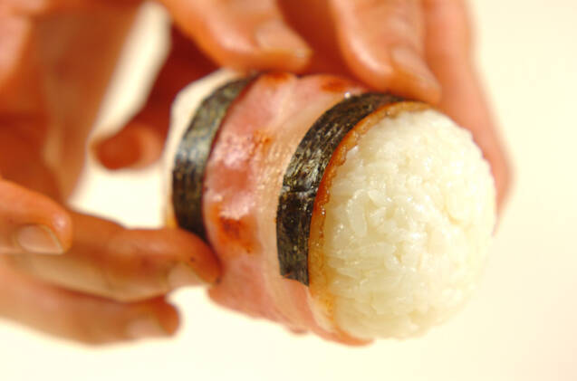 おにぎりにベーコンを巻きつけ、さらに焼きのりをベーコンの上に巻きつける。