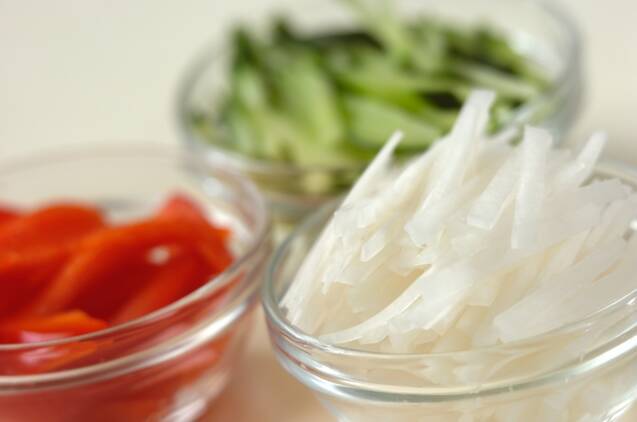 大根は皮をむき、太めのせん切りにする。キュウリは長さを半分に切り、大根に合わせて太めのせん切りにする。赤パプリカは種とワタを取り、縦薄切りにする。
