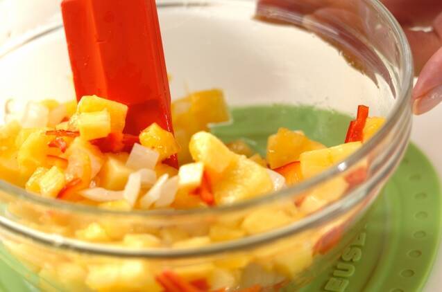 (1)にパイナップル、赤ピーマン、<調味料>の材料を加えて混ぜ、10分置いて器に盛る。