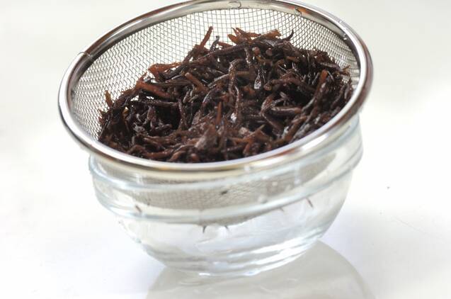 芽ヒジキはたっぷりの水で柔らかくもどし、ザルに上げて流水で水洗いし、水気をきる。
