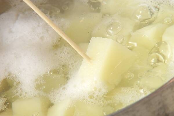 ジャガイモは鍋にヒタヒタの水と共に入れ、中火にかけ、ジャガイモが柔らかくなるまで7~8分ゆでる。竹串を刺してス~ッと刺されば、ゆで汁を捨て、中火にかけて水分を飛ばす。