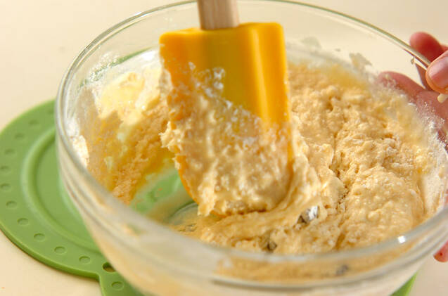 卵と合わせたオレンジジュース、バニラオイルを加える。なめらかに混ざったら、ホットケーキミックス、レーズンを加えて混ぜる。