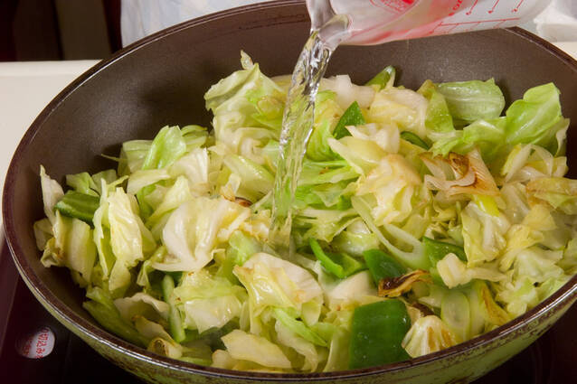 中華鍋にサラダ油大さじ1を強火で熱し、キャベツ、白ネギ、生シイタケ、ピーマンを軽く炒める。塩少々をして全体に炒まれば水100mlを加え、野菜がしんなりすればザルに上げる。