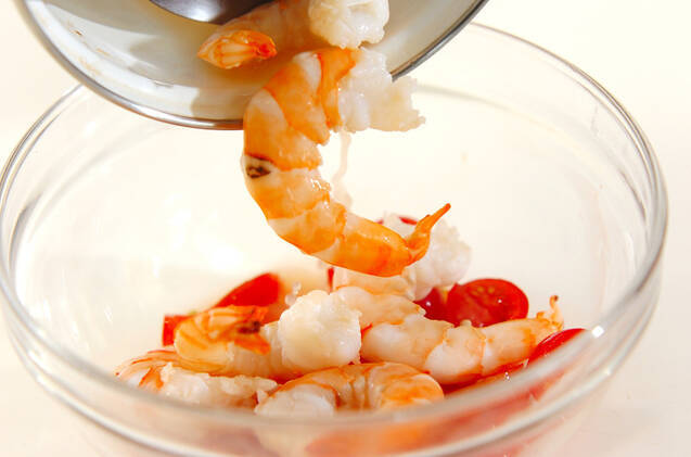 (1)のボウルに(2)のエビを汁ごと加えて和え、冷蔵庫で冷やす。