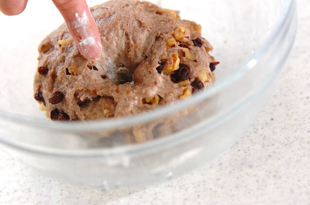 指に分量外の強力粉をつけてパンに穴をあけ、そのままの穴が残るか確認をする(フィンガーテスト)。ガス抜きをし、4等分して丸めなおし、分量外のライ麦粉を表面につける。