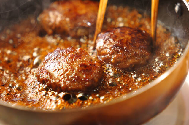 ハンバーグのタネを3等分し、小判型に形を整え、サラダ油を中火で熱したフライパンで両面焼き色をつけ、フライパンに蓋をして焼き、中まで火を通す。火が通ったら、<調味料>の材料を入れ、トロミが付くまで煮からめる。