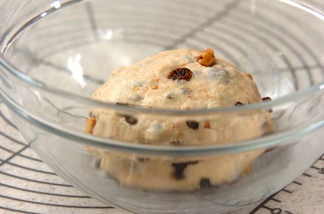 全体的に混ざったら、まとめて、閉じ目を下にしてボウルに入れてラップをして温かい所に置いて約2倍に膨らむまで待つ(一次発酵30℃、30~40分)。
