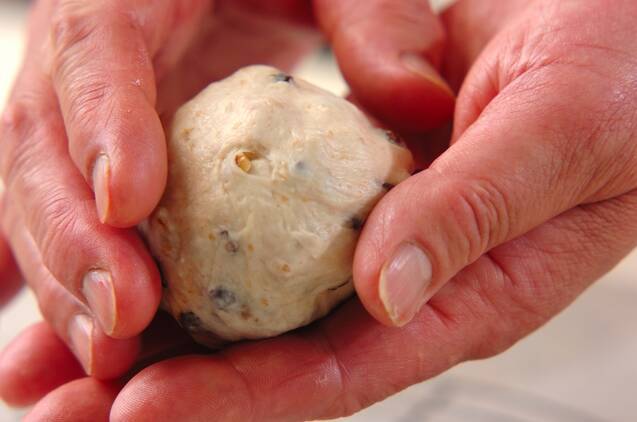 <成形する>(5)の生地を丸め直し、オーブンペーパーを敷いた天板にのせ、40℃くらいの温かい所で30~40分二次発酵する。オーブンを200℃に予熱しておく。