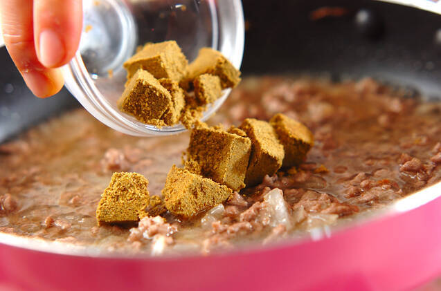 水を加えて煮たったら火を止め、カレールウを加えて弱火で煮る。ポッテリしたら、いったん器に取り出す。