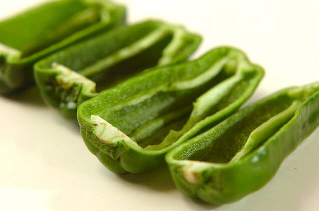 ピーマンは縦半分に切り、種とワタを取り除く。