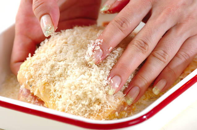 揚げ油を170℃に熱しはじめる。鶏もも肉の身の厚い部分を包丁の先で刺して、火の通りをよくしハーブソルトを全体にからめる。<衣>の小麦粉を薄く付け、溶き卵をくぐらせてパン粉をつける。