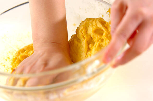 無塩バターが生地になじんだら、再びボウルの中で生地を押しつけるようにして力強くこねる。