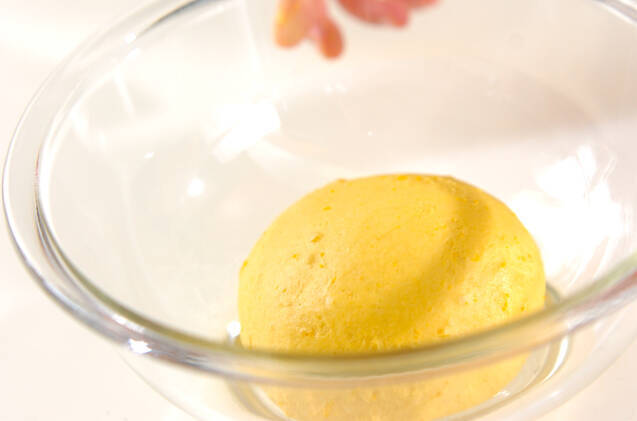 丸めた生地をボウルに入れ、ラップをかける。温かい所において一次発酵させる(40~60分)。