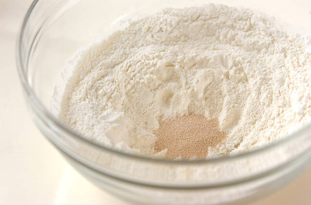 粉の真ん中にくぼみを作り、その中にイーストを入れる。
