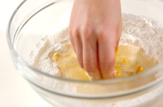 くぼみのまわりの粉をくずすようにして混ぜていく。
