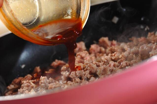 フライパンにゴマ油、ニンニクを入れ、弱火で香りが出るまで炒める。豚ひき肉、白ネギも加え、色が変わったら<A>も加えてよく炒める。