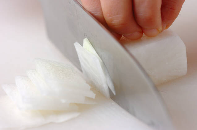 大根は皮をむき、食べやすい大きさの短冊に切る。