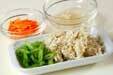 切干し大根はたっぷりの水に10分位浸して柔らかく戻し、水気を絞ってザク切りにする。