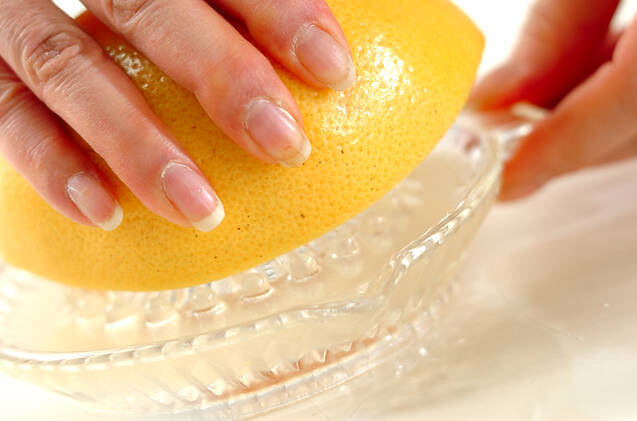 グレープフルーツは水洗いし、横半分に切って搾り器で搾る。白いところは苦味がありますので搾りすぎないように注意。