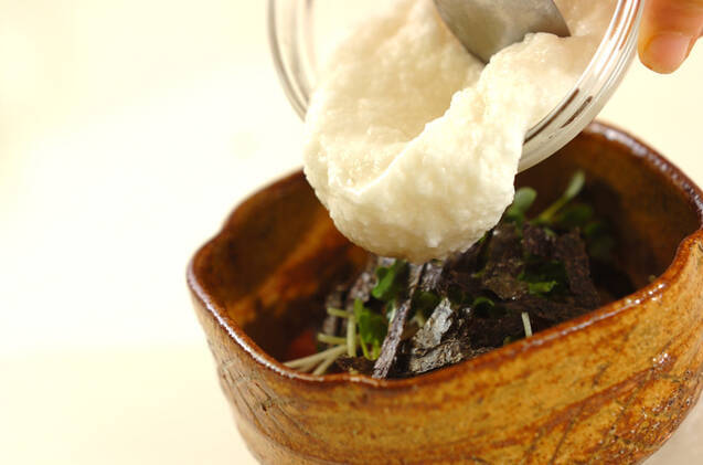 器にサーモンを盛り付けて貝われ菜、もみのりを散らす。大和芋をかけ、お好みでしょうゆをかけ、よく混ぜ合わせていただく。