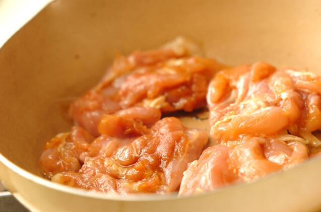 残りのサラダ油を加えて中火にかけ、鶏もも肉の汁気を軽くきって皮側を下にして並べる。焼き色がついたら返して弱火にし、同様に焼き色がつくまで焼く。
