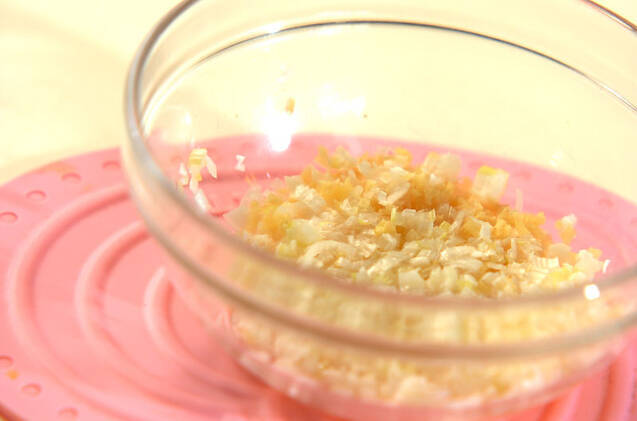 耐熱容器に白ネギ、ショウガ、サラダ油を入れて電子レンジで約1分加熱する。